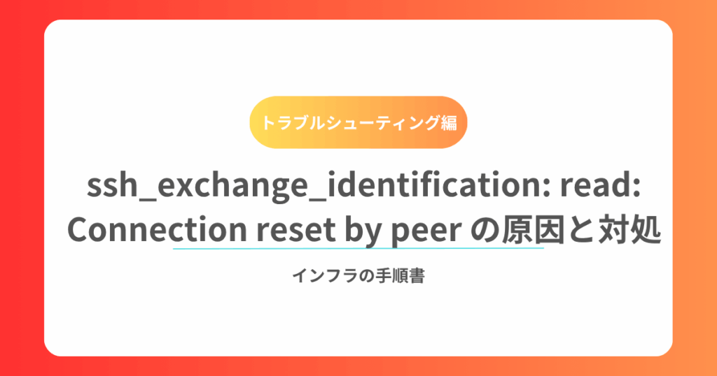 1. エラー概要 SSH 接続を試みた際に以下のエラーが表示され、接続が拒否されることがあります。 ssh_exchange_identification: read: Connection reset by peer このエラーは、サーバー側で接続が開始直後にリセットされた場合に発生します。原因は多岐に... -