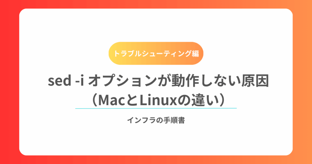 はじめに Linuxでよく使われる sed -i オプションは、**ファイルを直接書き換える(インプレース編集)**ために利用されます。 ところが、同じコマンドをMacで実行すると、以下のようなエラーが出て動かないことがあります。 $ sed -i 's/foo/bar/' sample... -