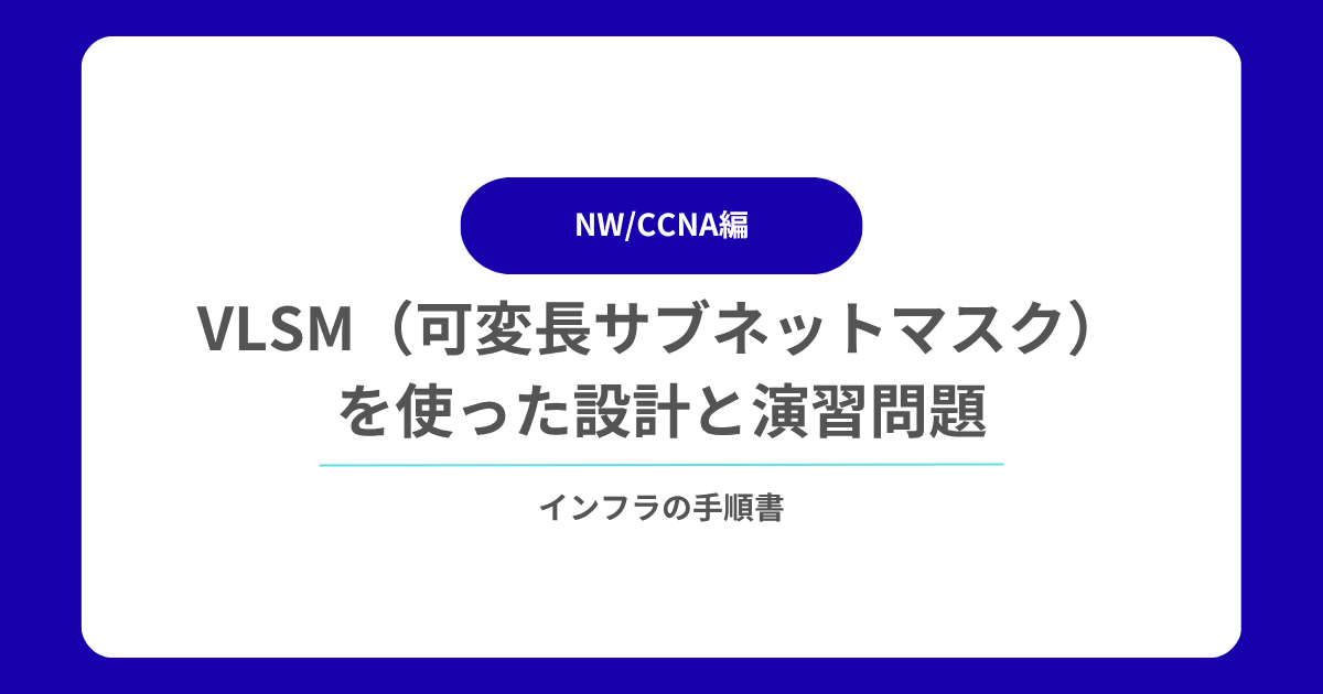 ネットワーク設計では、限られた IP アドレス空間を効率的に分割することが重要です。 このとき活用される技術が VLSM(Variable Length Subnet Mask:可変長サブネットマスク) です。 本記事では、VLSM の概要、設計手順、具体例、そして練習問題を交えて解説します。