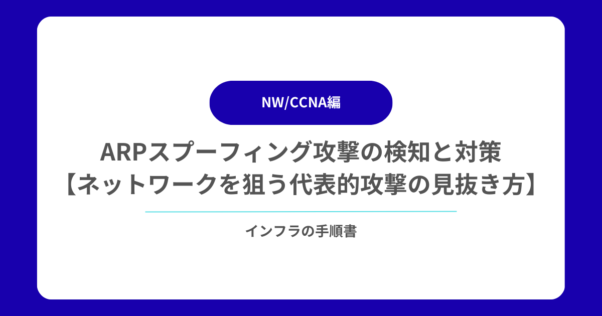 ARPスプーフィングは、攻撃者が偽の ARP Reply を送信してネットワーク上の通信を盗聴・改ざん・遮断する手法です。本記事では、実務で使える 検知方法、ログ例、キャプチャ例、対策、再発防止策 をまとめています。