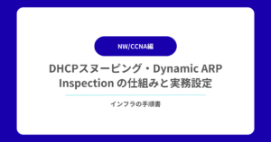 DHCPスヌーピング(DHCP Snooping)と Dynamic ARP Inspection(DAI)は、L2ネットワークにおける不正攻撃(なりすまし)を防ぎ、業務ネットワークの安全性を高めるため…