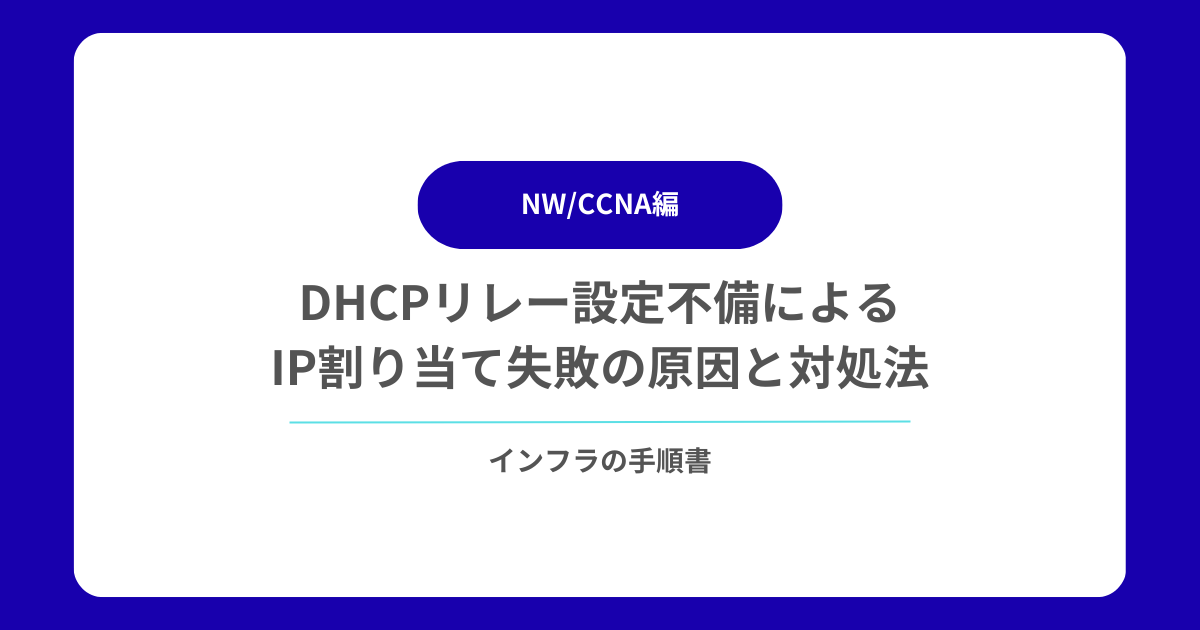 DHCPサーバーが別セグメントにある環境では、DHCPリレー(IP helper)が正しく動作していないと、クライアントがIPを取得できません。本記事では、実務で特に多い設定漏れパターン、再現例、確認手順、復旧方法、再発防止策をまとめます。