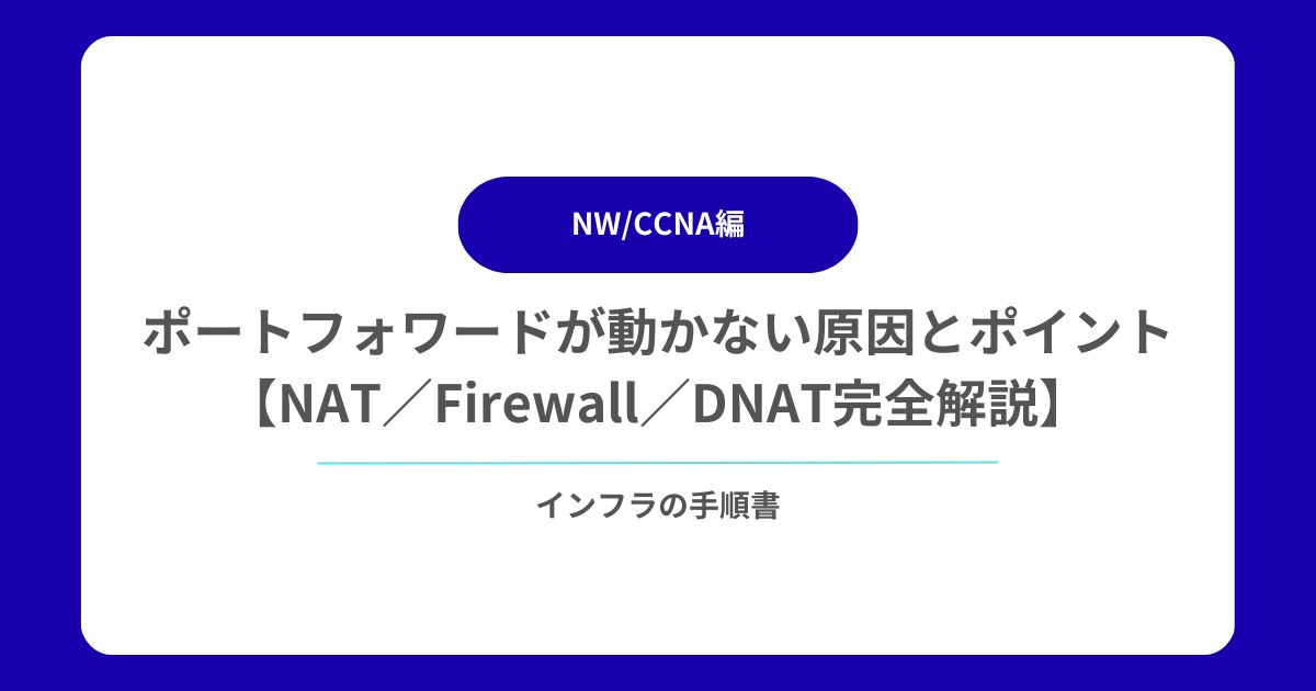 この手のトラブルは NAT・Firewall・ルーティングのどこか で必ず詰まっています。 本記事では、ポートフォワード(DNAT)が動かない原因実務でそのまま使える切り分け手順 として解説します。
