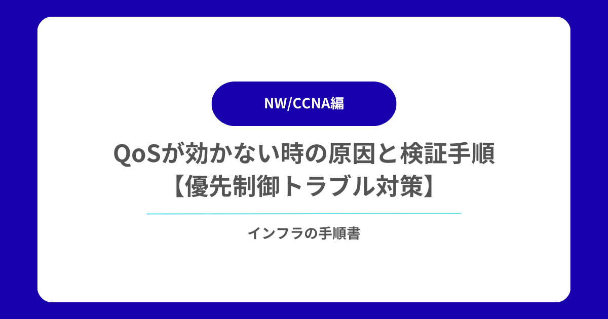 QoS(Quality of Service)が正しく動作していないと、遅延・輻輳・帯域逼迫により VoIP や業務アプリが不安定になります。本記事では、QoS が「効かない」典型原因と、現場で実際に使用される検証手順、show コマンドの例を交えて分かりやすく解説します。